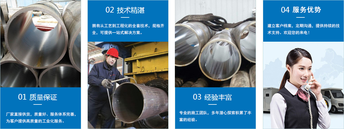 目前公司品種規(guī)格為:內徑直徑30mm—300mm,壁厚為2mm—40mm。技術條件為:內孔精度H5—H10,內孔粗糙度Ra≤0.63um,直線度≤0.3mm/m。鋼號是20#—45#、16Mn、27SiMn及部分低合金鋼,標準GB8713-88。規(guī)格為40-300*2-40MM,長度為2-12M的各種類型油缸管,年產(chǎn)銷售能力3萬噸。公司設備先進,工藝優(yōu)化,檢測手段完善。
